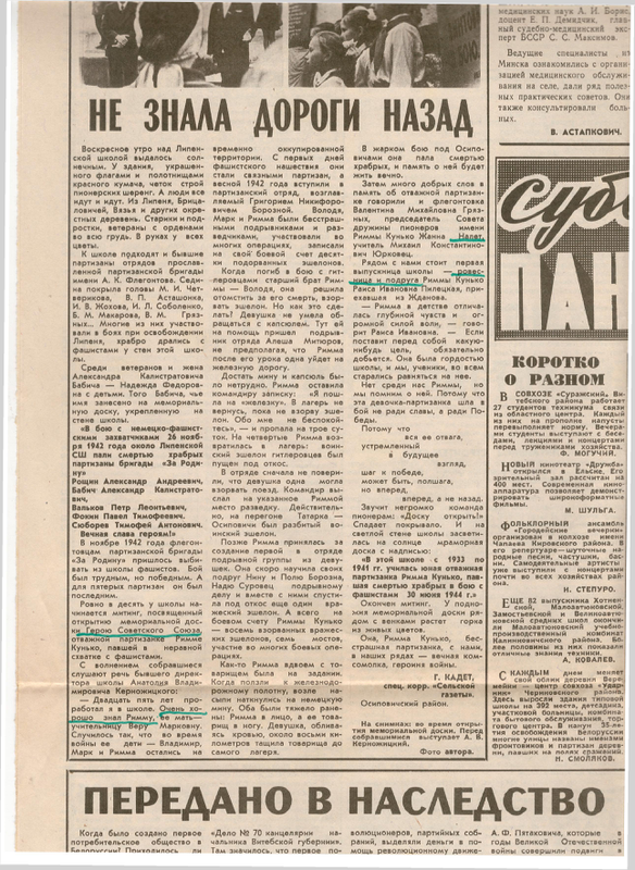 Статья Г. Кадет в "Сельской газате" от 28 июня 1979 года об открытии мемориальной доски в честь Риммы Владимировны Кунько на здании Липеньской средней школы.