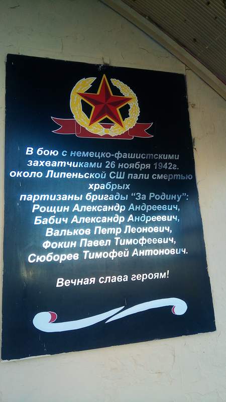 Мемориальная доска, открытая на здании Липеньской школы в 1973 году. Посвящена партизанам бригады "За Родину!", Погибшим у стен Липеньской школы 26 ноября 1942 года.