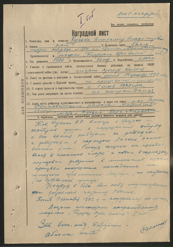 Наградной лист Кунько Владимира Владимировича медалью "Партизану Великой Отечественной войны" I степени (посмертно).